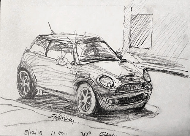 This is the first of two drawings done of the same scene at the same time of day, but with different vehicles on different days. I was sitting on the porch waiting for the sky to begin lighting up just a bit before I took an early walk. Not having done many sketches in the dark, and knowing how "enlightening" they can be, I had been looking for a good opportunity to do some more. So the chance came at an unexpected moment.